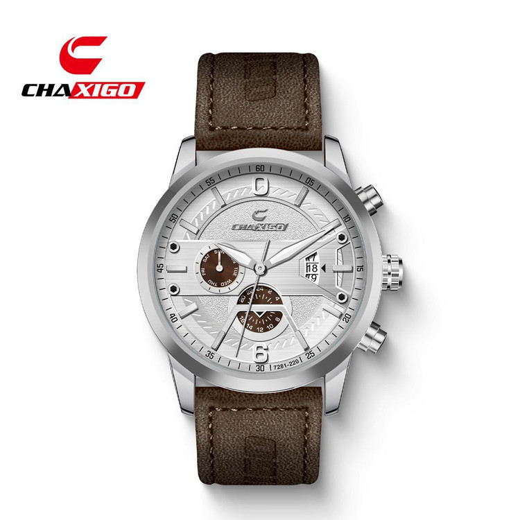روز شمار طرح کرنوگراف برند شرکتی کیفیت عالی بند چرمی ضخامت ۱۱ میلی متر قطر صفحه ۴۳ میل ضدآب شیشه معدنی رنگ ثابت قفل کمربندی موتور کوارتز