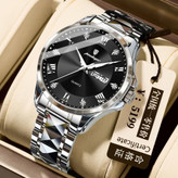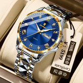 دارای روز شمار ایام هفته صفحه شب نما برند شرکتی بند استیل قطر صفحه ۴۲ میل کریستال قاب یاقوت کبود ضدآب تا عمق بالا شیشه معدنی رنگ ثابت قفل سگک دوپروانه ای موتور کوارتز