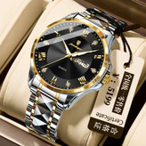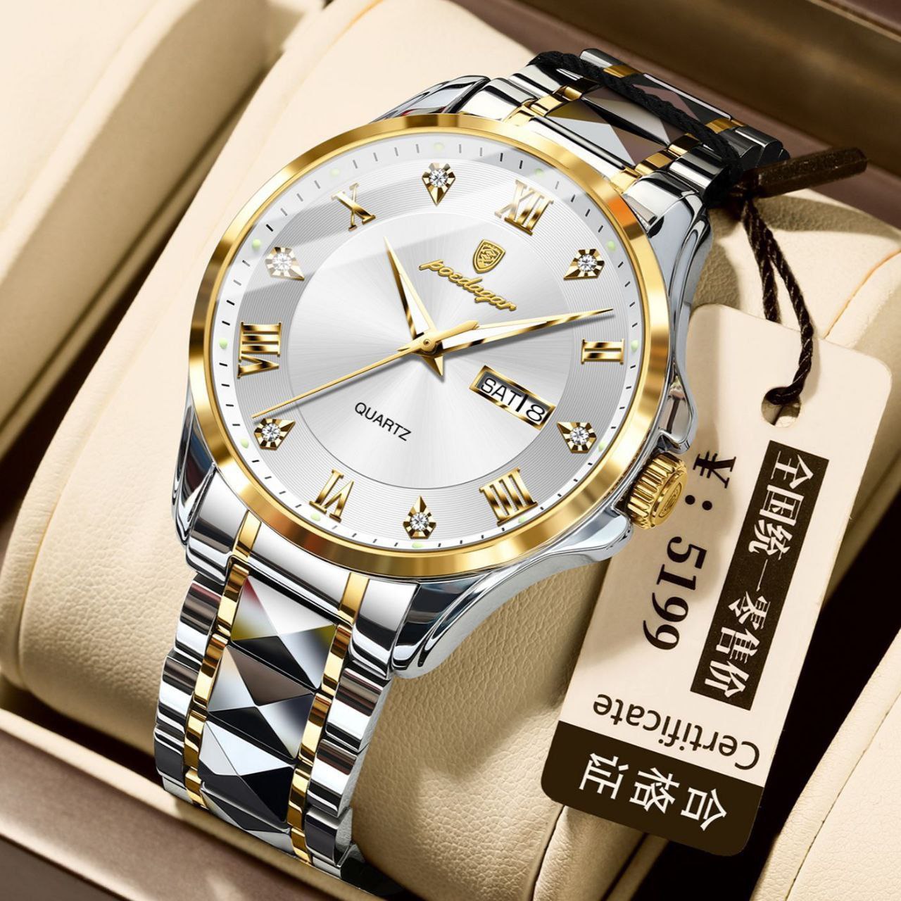 اطلاعات محصول : : دارای روز شمار ایام هفته صفحه شب نما برند شرکتی بند استیل قطر صفحه ۴۲ میل کریستال قاب یاقوت کبود ضدآب تا عمق بالا شیشه معدنی رنگ ثابت قفل سگک دوپروانه ای موتور کوارتز