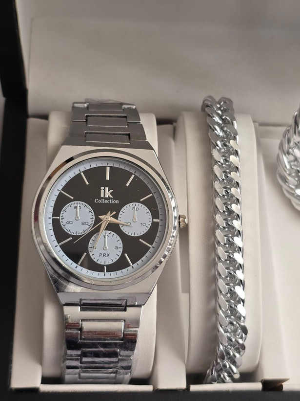 ست مردانه ساعت و دستبند و گردنبند زنجیر آلومینیومی و حلقه استیل( سایز ۶ تا ۱۰)