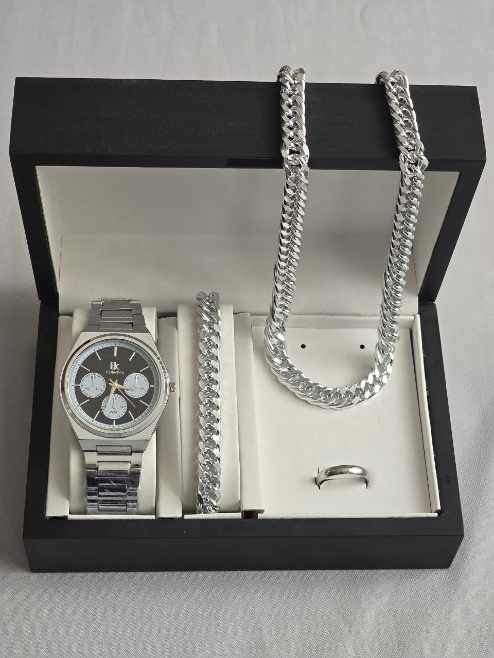 ست مردانه ساعت و دستبند و گردنبند زنجیر آلومینیومی و حلقه استیل( سایز ۶ تا ۱۰)