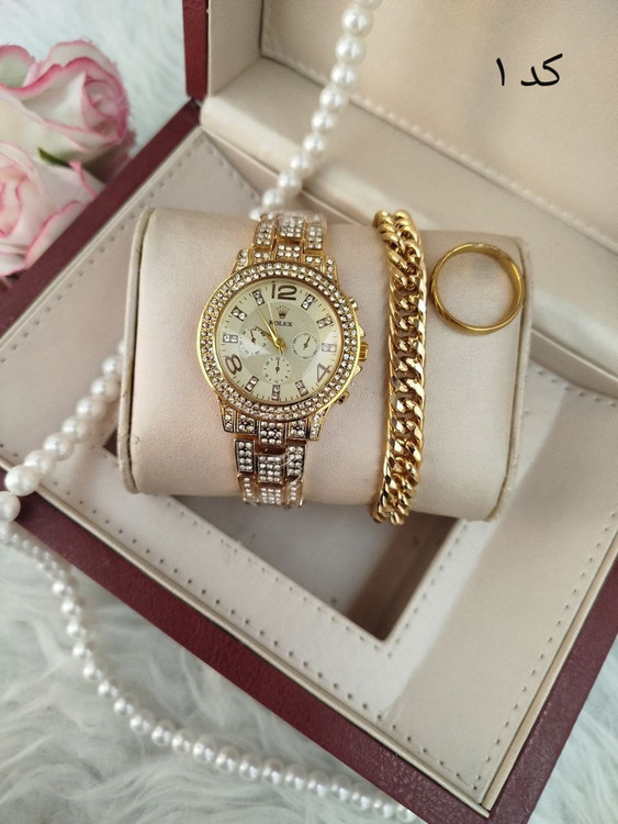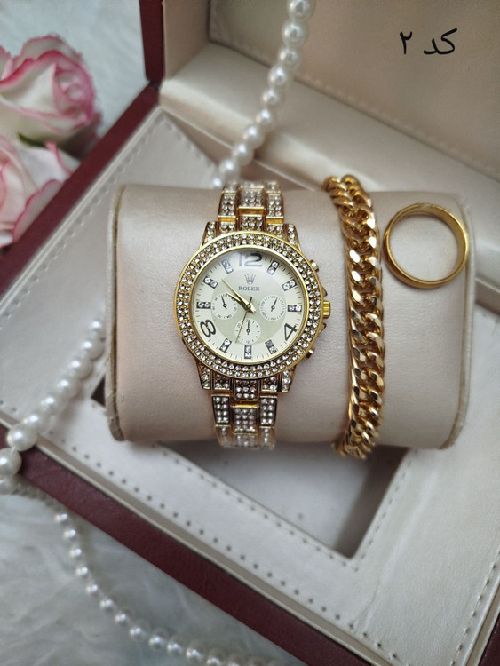 اطلاعات محصول :: ⌚️ساعت زنانه مارک رولکس ⌚️ ✔️فول نگین ✔️تک موتوره ✔️طرح سه موتوره ✔️رنگ ثابت ✔️کیفیت عالی ✔️دارای جعبه کادویی ⬅️قطر شیشه ساعت حدودا ۳۰ میلیمتر ✔️دستبند کارتیر رنگ ثابت ضد حساسیت ✔️حلقه ی رینگی طلایی رنگ ثابت استیل