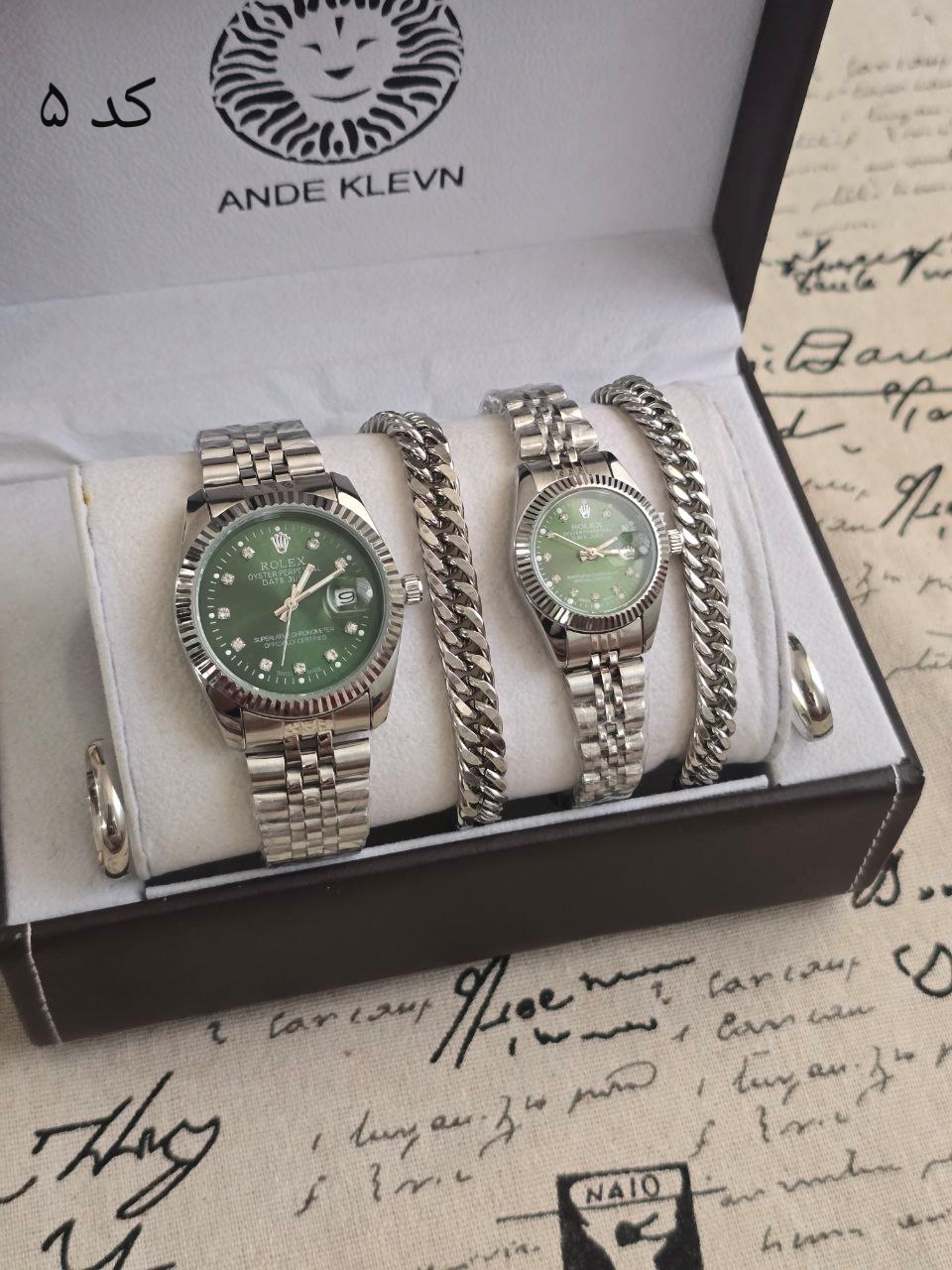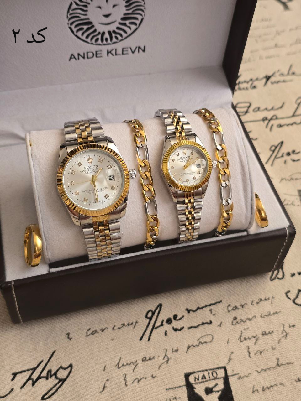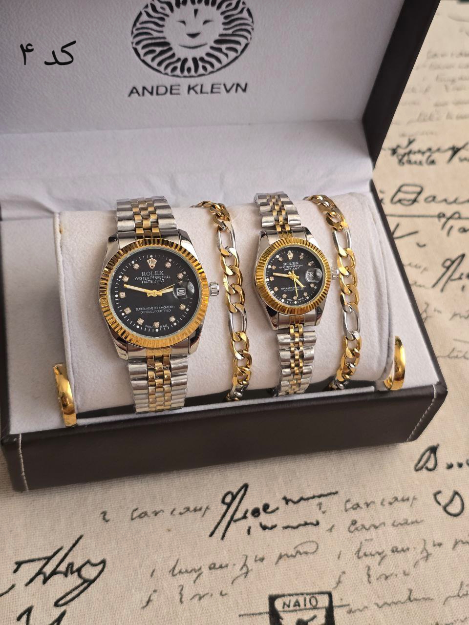 ست ساعت زنانه و مردانه برند رولکس بهمراه دو عدد دستبند کارتیر استیل و دو تا انگشتر(سایز 6 تا 10)