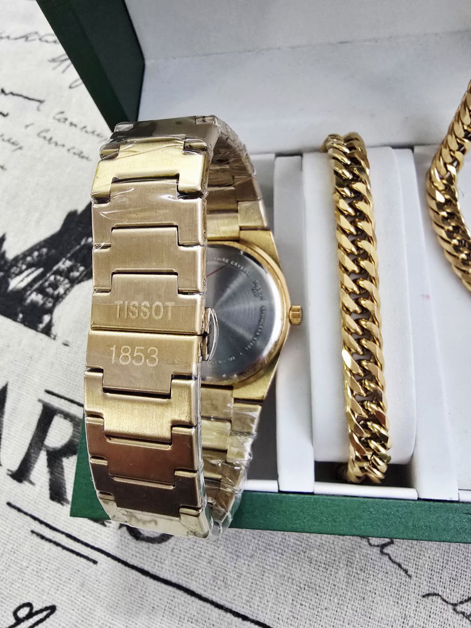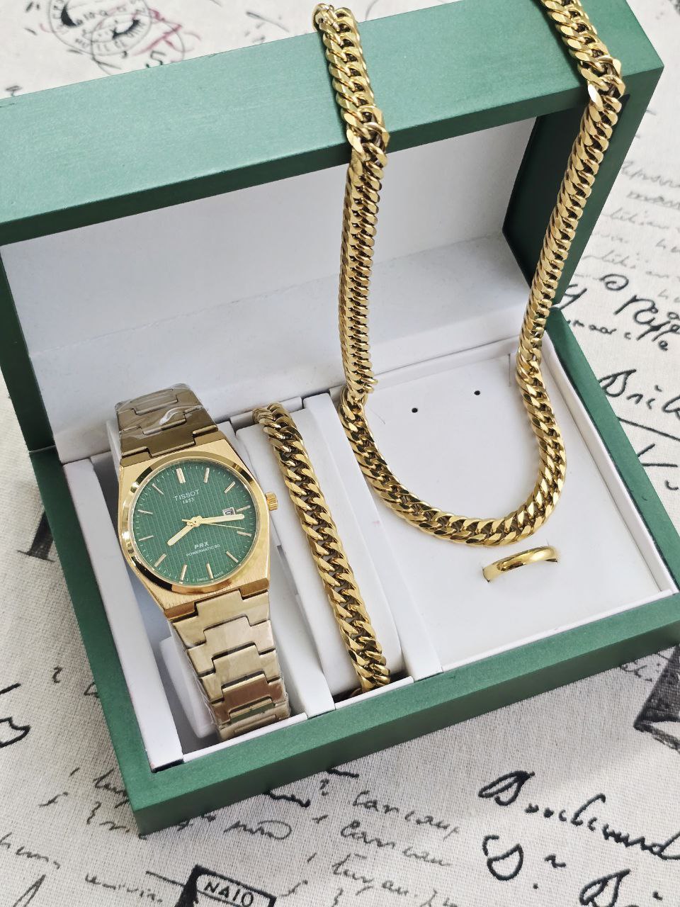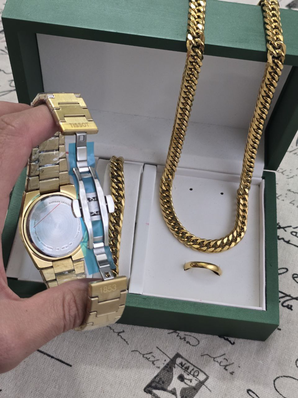 ست مردانه ساعت تیسوت و دستبند و گردنبند زنجیر استیل و حلقه استیل( سایز ۶ تا ۱۰)