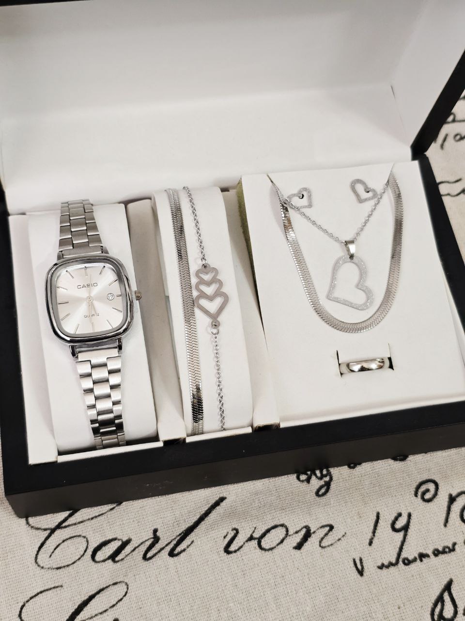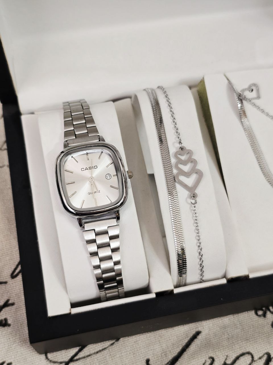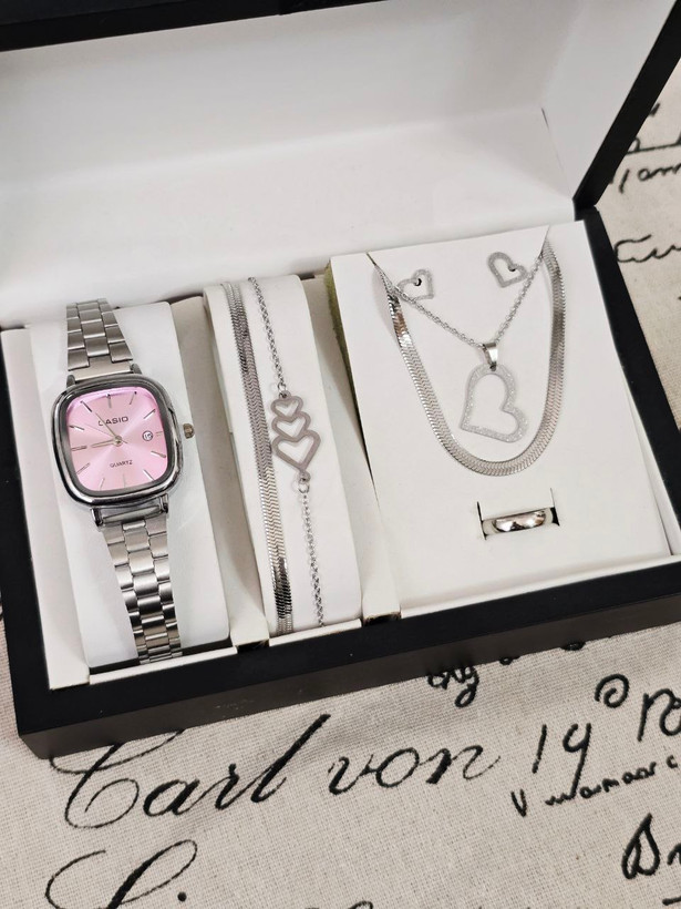 ست زنانه و دخترانه ساعت کاسیو تقویم فعال و دستبند و نیمست استیل و حلقه