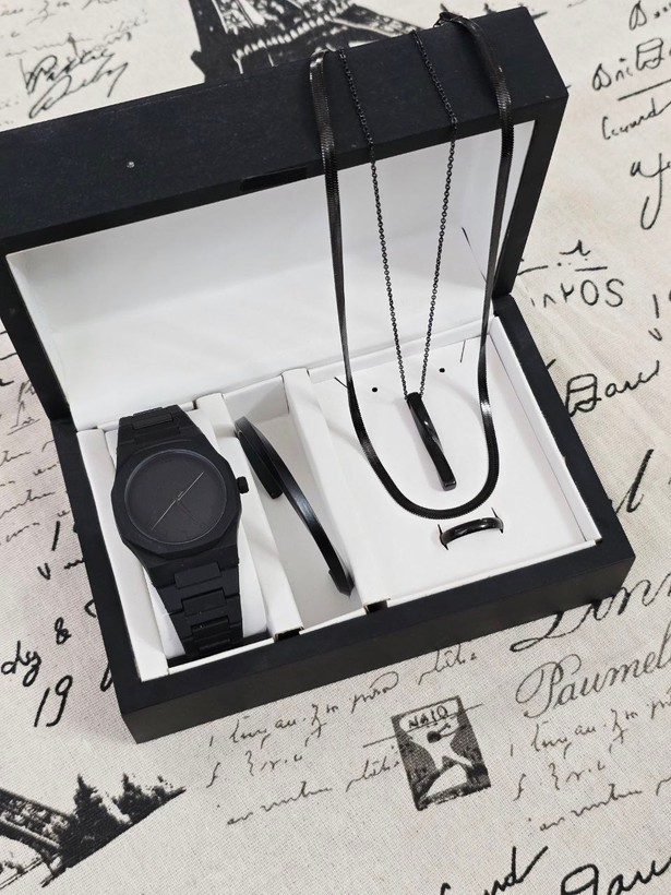 ست مردانه ساعت سیلیکنی مشکی طرح AP و بنگل و گردنبند و حلقه