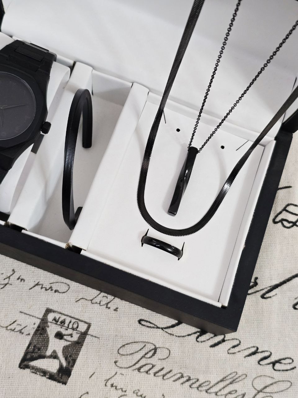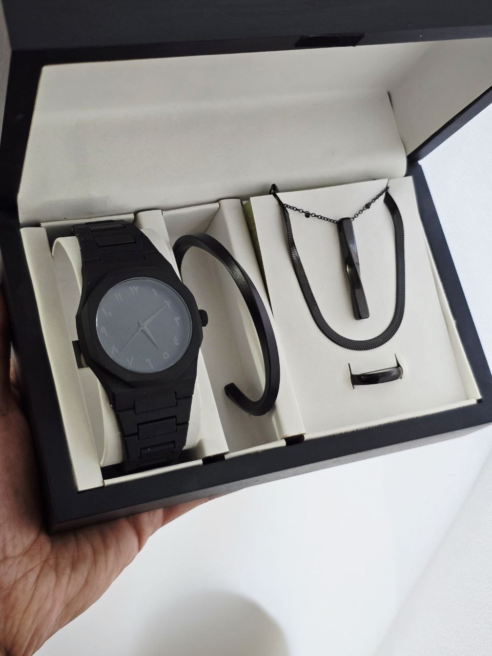 ست مردانه ساعت سیلیکنی مشکی طرح AP و بنگل و گردنبند و حلقه
