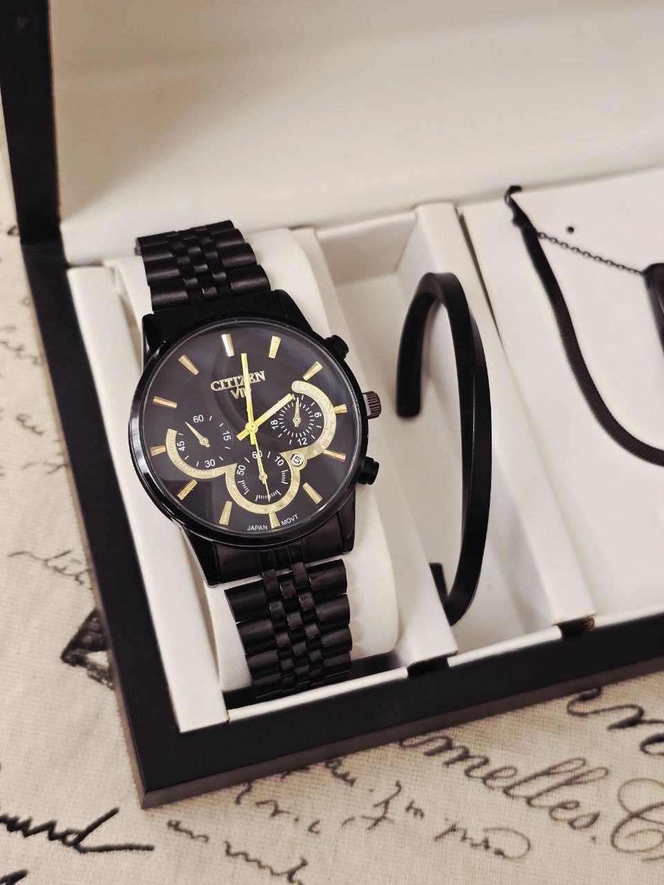 ست مردانه ساعت سیتیزن تقویم دار و بنگل و گردنبند و حلقه