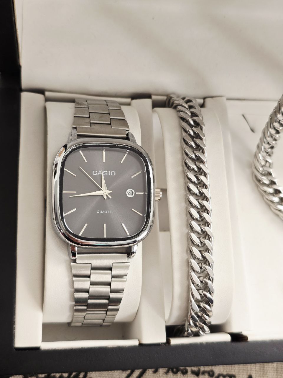 ست مردانه ساعت کاسیو تقویم فعال و دستبند و گردنبند زنجیر استیل و حلقه استیل( سایز ۶ تا ۱۰)