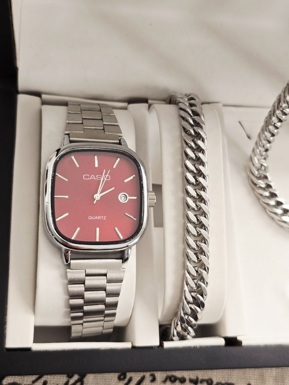 ست مردانه ساعت کاسیو تقویم فعال و دستبند و گردنبند زنجیر استیل و حلقه استیل( سایز ۶ تا ۱۰)