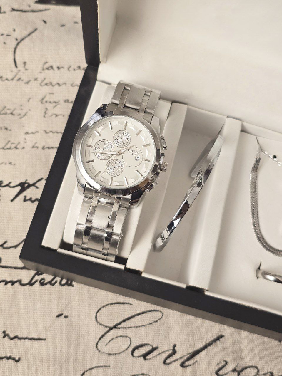 ست مردانه ساعت تیسوت مردانه تقویم فعال و بنگل و گردنبند و حلقه