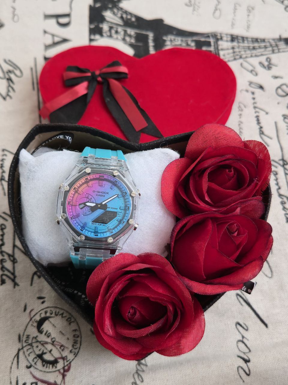 پک زنانه و دخترانه ساعت و دستبند و نیمست استیل و حلقه بهمراه باکس و گل مصنوعی