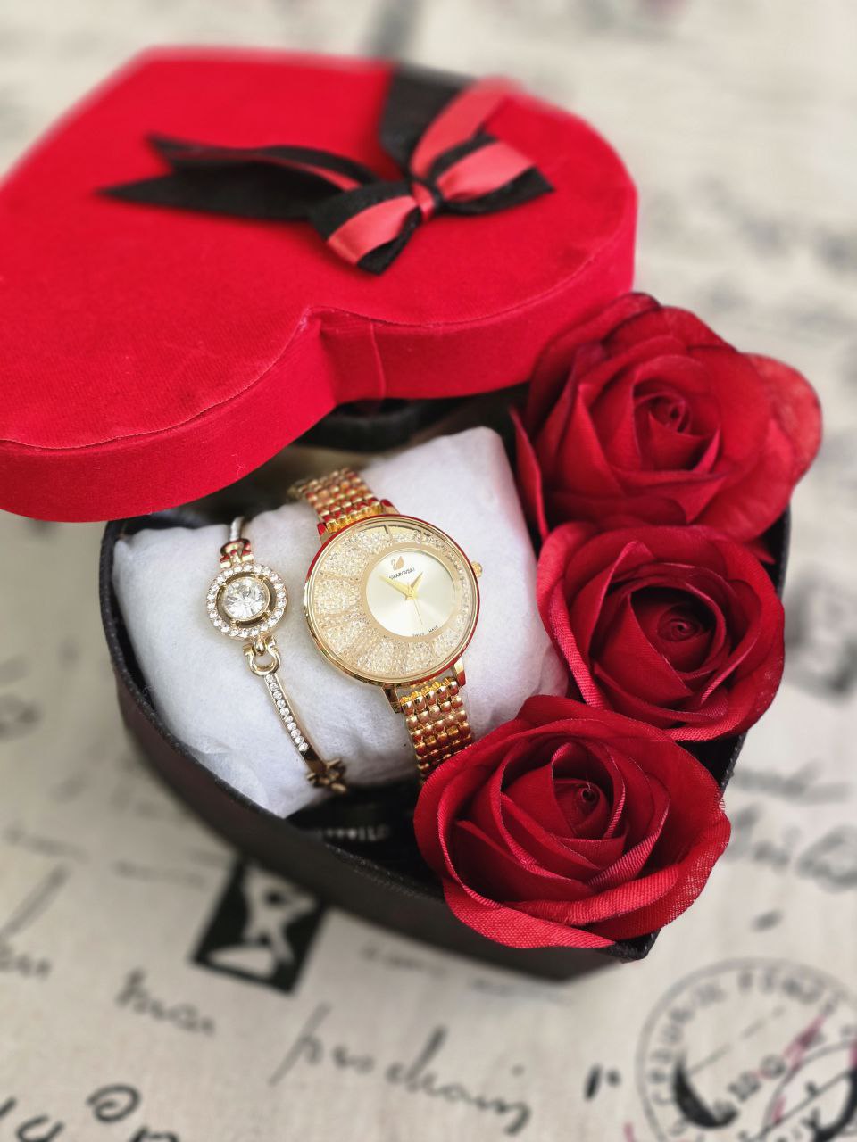 باکس هدیه زنانه و دخترانه ساعت و دستبند و نیمست و باکس و گل