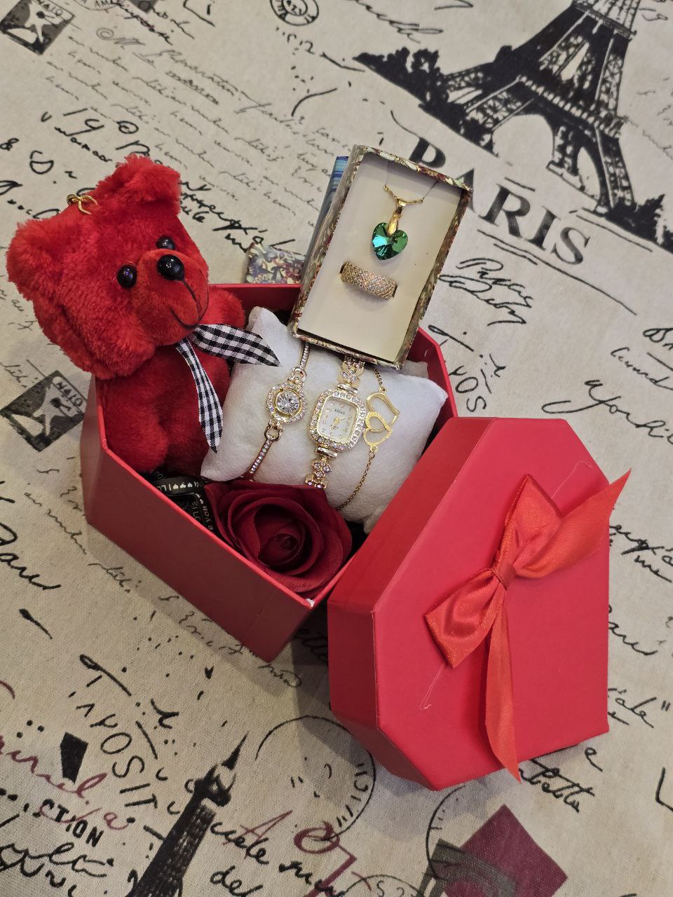 پک زنانه و دخترانه ساعت و دستبند و گردنبند و انگشتر بهمراه باکس و گل مصنوعی